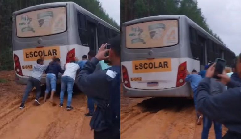 Um vídeo que está circulando nas redes sociais mostra um grupo de estudantes da cidade de Santo Amaro, no Recôncavo Baiano, empurrando um ônibus escolar que ficou atolado na lama, na manhã desta quinta-feira (06).