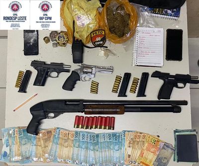 Duas pistolas calibres 380 e 40, uma espingarda, um revólver, dois carregadores para pistola, 39 munições, porções de drogas, celulares, relógio, caderno de anotações, um rádio comunicador e cerca de R$ 5,8 mil foram apreendidos pelos policiais.