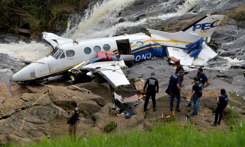 A aeronave, um bimotor, foi puxada por um guindaste e retirada das pedras próximas a uma cachoeira. Na noite de sábado (6), o aparelho já havia sido retirado da correnteza da cachoeira, onde caíra após colidir com uma linha de transmissão de energia elétrica.