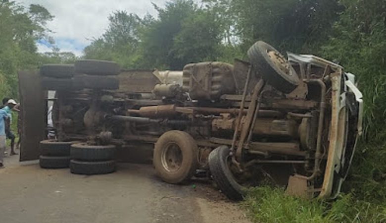 Uma caçamba tombou na descida de Capoeiruçu, nas proximidades dos Três Riachos na manhã desta terça-feira (13), em Cachoeira.