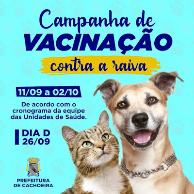A Secretaria de Saúde de Cachoeira, por meio da Coordenação de Vigilância Epidemiológica, realiza a Campanha de Vacinação contra Raiva, de 11 de setembro a 02 de outubro de 2020.