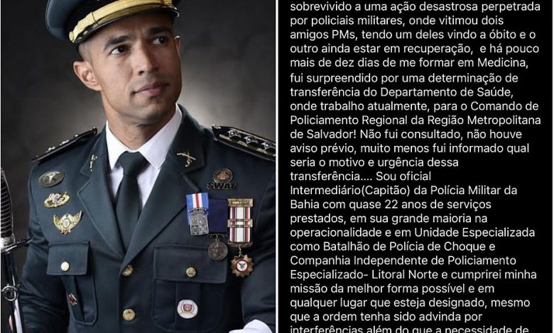 Ele está prestes a se formar em medicina e, nas redes sociais, revelou sua tristeza com a situação. “No dia de hoje, 16 dias após ter sobrevivido a uma ação desastrosa perpetrada por policiais militares, onde vitimou dois amigos PMs, tendo um deles vindo a óbito e outro ainda está em recuperação, e a pouco mais de dez dias de me formar em Medicina, fui surpreendido por uma determinação de transferência”, relatou, ao ressaltar não ter sido “consultado, não houve motivo e urgência dessa transferência”.