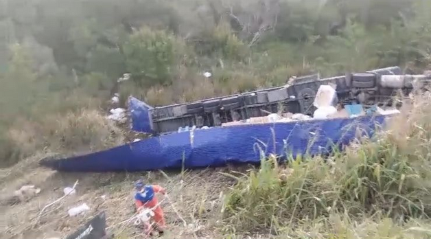Uma carreta carregada de alimentos caiu em uma ribanceira às margens da Rodovia Santos Dumont BR-116, na altura do KM 652, entre os municípios de Jequié, Lafaiete Coutinho e Jaguaquara. O acidente aconteceu neste sábado (27), no final da tarde, na estrada do sudoeste baiano.