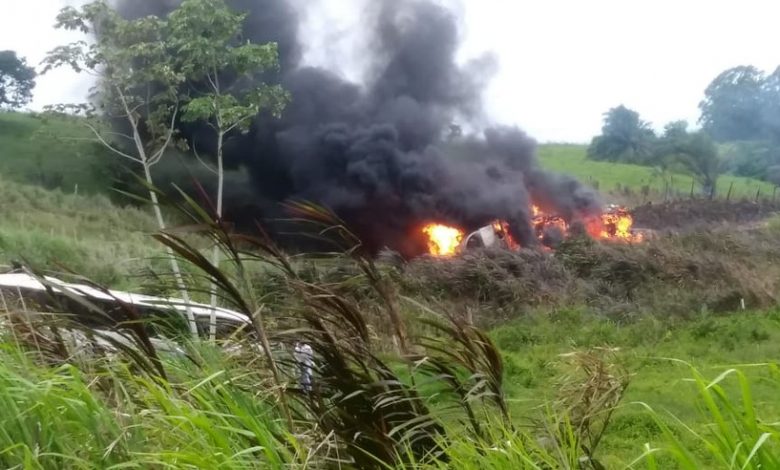Uma carreta carregada de combustível pegou fogo após um acidente com uma caminhonete e um ônibus na BR-101, na altura do município de Itapebi, sul da Bahia, na manhã deste sábado (28). Após o acidente, a pista foi interditada. Não há previsão para reabertura da via.