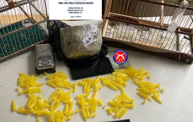 Durante a abordagem, os policiais conseguiram apreender 489 gramas de maconha, 107 pinos para acondicionar drogas e 2 pássaros silvestres.