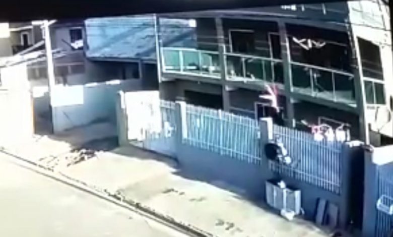 Franciele explicou que a criança acabou passando por uma fresta que tem na sacada. As imagens mostram que ela ficou pendurada por alguns segundos antes da queda.