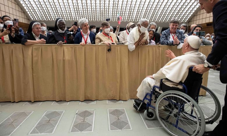Em uma audiência com um grupo de freiras na sala de audiências gerais do Vaticano, Francisco foi levado para seu assento no palco. Um assessor então o ajudou a sair da cadeira de rodas e a se sentar.