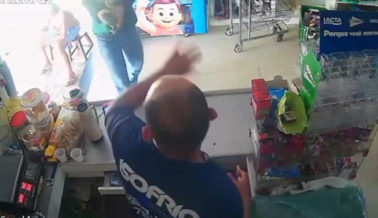 A ação foi registrada por uma câmera de segurança. Nas imagens, é possível ver o momento em que o suspeito chega ao local em uma motocicleta e entra no comércio usando capacete. Ao se aproximar do proprietário, ele saca uma arma que estava na cintura.