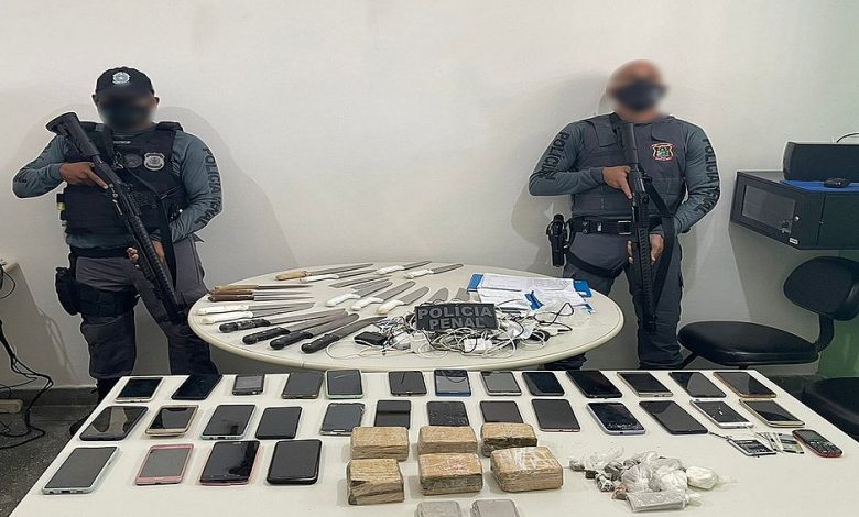 Foram localizadas 24 unidades de facas, facões e lâminas cortantes, além de 30 celulares e quilos de drogas nas celas. Também foram apreendidos oito cadernos com anotações relacionadas ao comércio ilegal de drogas e balanças de precisão.