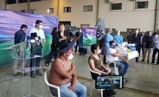 Após a chegada da vacina contra a Covid-19 em Porto Velho/RO, o governo de Rondônia fez um ato solene para a aplicação da primeira dose da vacina no saguão da FAB na manhã desta terça-feira (19), em dois em convidados pela saúde do estado e um indígena. Os perfis que foram escolhidos foram de pessoas que prestam um serviço importante no estado e representam todos os profissionais de saúde. Foram escolhidos: uma médica, um enfermeiro e uma indígena da Etnia Karitiana.
