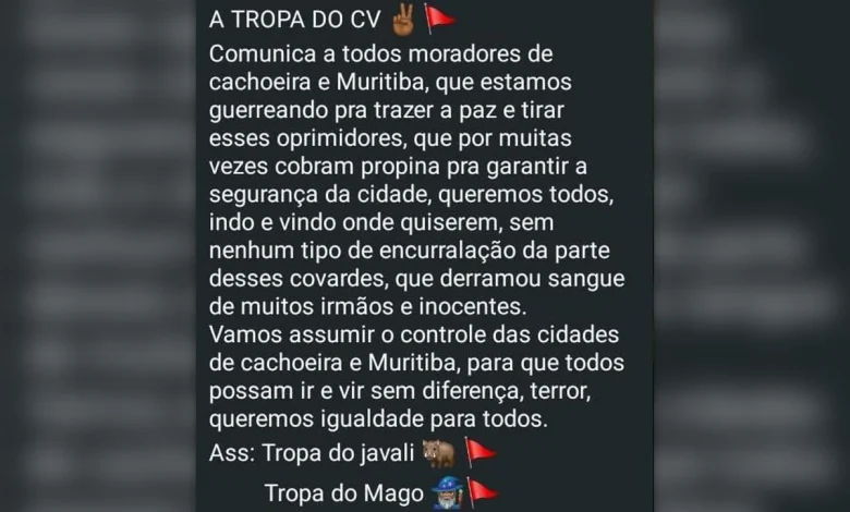 “Estamos guerreando para trazer a paz e para retirar esses opressores”. O texto que circula nas redes sociais é assinado pelas tropas do Javali, Mago e Urso, que formam a “Tropa do CV”, que já conquistaram São Félix.