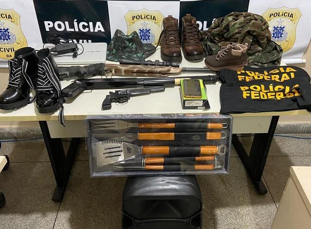 Além da prisão, as equipes da delegacia de Paulo Afonso apreenderam com o suspeito uma espingarda, duas réplicas de armas de fogo, duas camisas falsas da Polícia Federal, um chapéu e uniformes camuflados, coturnos, uma luneta, além de um notebook e dois celulares roubados.
