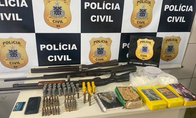 De acordo com a SSP, com o suspeito, também foram encontrados um fuzil, duas espingardas, 131 munições para diversos calibres, um quilo de cocaína em pó, 700 gramas de crack, porções de maconha, duas balanças, um celular e um caderno de anotação do tráfico.
