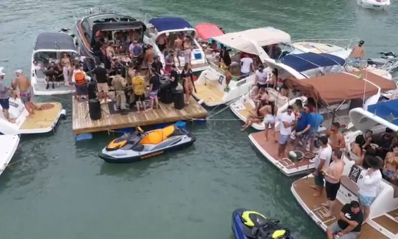 Fiscalização interrompe festa no mar com mais de 20 lanchas e show em deck flutuante em SC