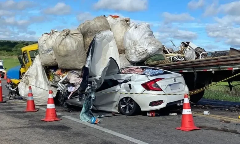 A colisão aconteceu em trecho da BR-116 e envolveu um carro de passeio com um caminhão que transportava sucata.