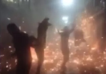 Nas imagens, um grupo de pessoas aparece pulando e gritando enquanto realizam a guerra de espadas. Não é possível identificar se alguma delas utilizam equipamentos de segurança.