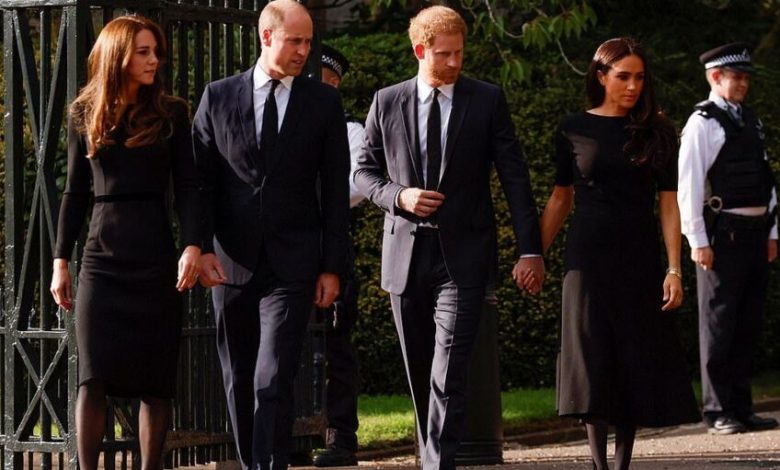 William, Harry, Meghan e Kate andaram lado a lado pelos portões da propriedade de Berkshire. Uma fonte do Palácio de Kensington disse ao Daily Mail que o próprio William convidou o irmão e sua esposa para se juntarem à despedida da rainha.