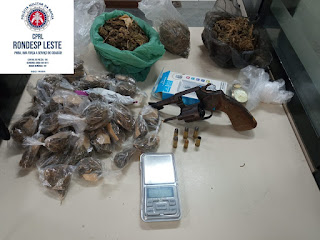 Ele tentou fugir, mas foi localizado. Com ele, foram encontrados: um revólver calibre 32, cinco munições intactas e uma deflagrada, 52 porções de maconha, 3 frações grandes de erva análoga à maconha, um relógio e uma balança de precisão.