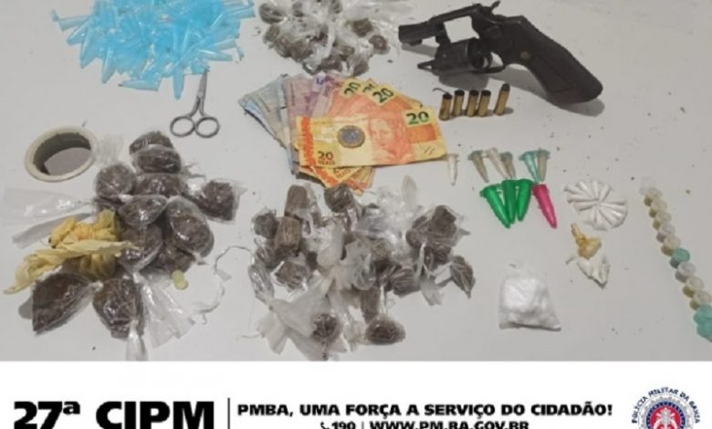 Na ação, a PM apreendeu 1 revólver calibre 38, 22 embalagens e 4 buchas de cocaína, 9 embalagens de maconha, 62 buchas da mesma droga, 62 embalagens para acondicionamento de entorpecentes, 1 tesoura, R$124,00 em espécie.