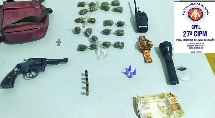 Na ação, os agentes apreenderam 1 revólver calibre 38, 21 trouxinhas de maconha, 4 pinos de cocaína, 1 rádio comunicador, 1 lanterna, 1 relógio e R$100,00 em espécie.