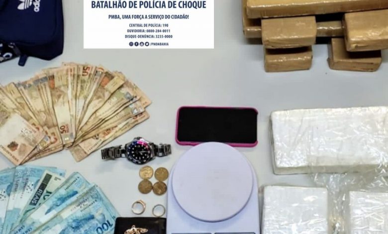 Dez quilos de entorpecentes (maconha e cocaína), além de R$ 10 mil em espécie, balança e celular foram apreendidos pela Companhia de Patrulhamento Tático Móvel (Patamo) do Batalhão de Choque, com um homem que respondia em liberdade por tráfico de drogas. O flagrante ocorreu na quarta-feira (20), no bairro de Novo Horizonte, em Salvador.