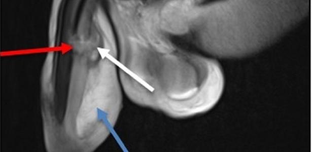O paciente foi encaminhado para a ala cirúrgica de emergência, onde um urologista realizou o reparo da fratura peniana. Uma ultrassonografia revelou a presença de um hematoma nos corpos cavernosos do pênis, com maior intensidade no lado esquerdo. Por meio de ressonância magnética, os locais das lesões foram identificados.