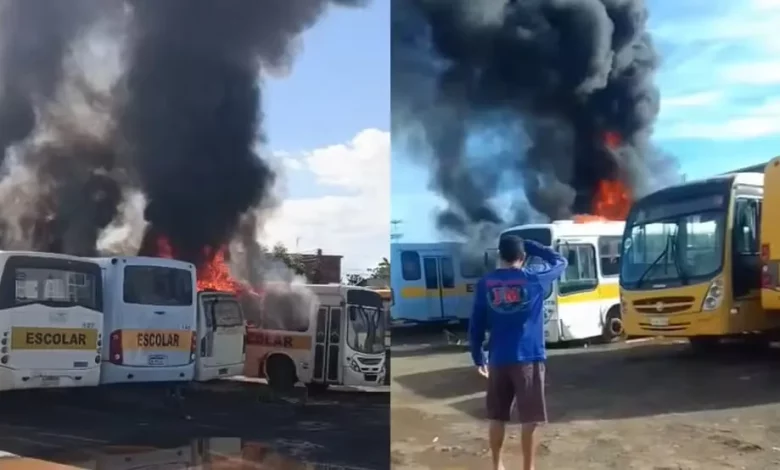 Incêndio atinge ônibus escolares ao lado de posto de combustível