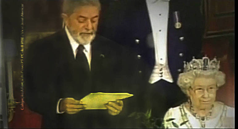 Na imagem, o petista aparece ao lado da rainha enquanto o narrador faz uma comparação com o passado do então presidente.
