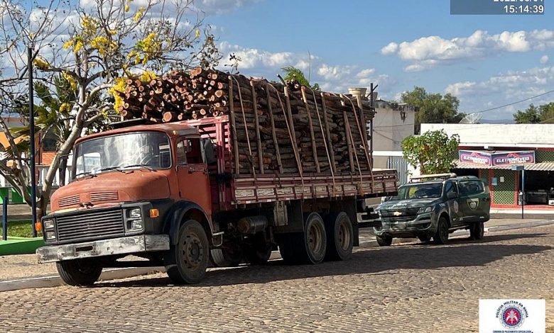Um caminhão que transportava cerca de 36m³ de madeira foi apreendido, nesta segunda-feira (1º), no município de Oliveira dos Brejinhos, no Centro-Sul. O material foi avaliado em meio milhão de reais pela polícia.