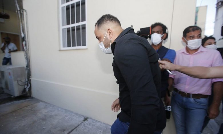 Suspeito de atentado contra o Bahia, Marcelino Neto chegou à delegacia acompanhado do advogado (Foto: Arisson Marinho/CORREIO)