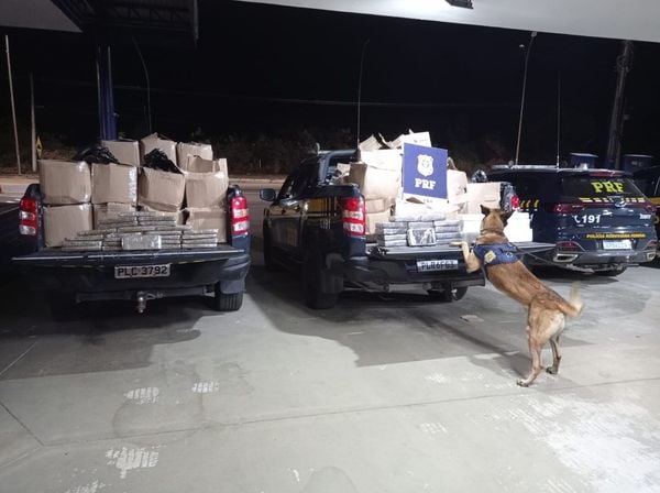 Com o auxílio do cão policial K9 KALEU, os agentes procederam com uma minuciosa vistoria no caminhão, levantando suspeitas quanto ao seu conteúdo. Após uma averiguação detalhada do compartimento de carga, foi descoberto cerca de 960 kg de maconha e 36,3 kg de cocaína, distribuídos em 50 caixas que estavam escondidas entre materiais diversos.