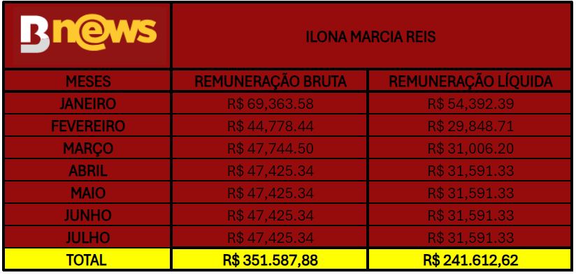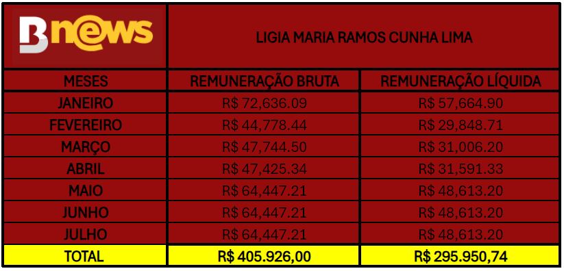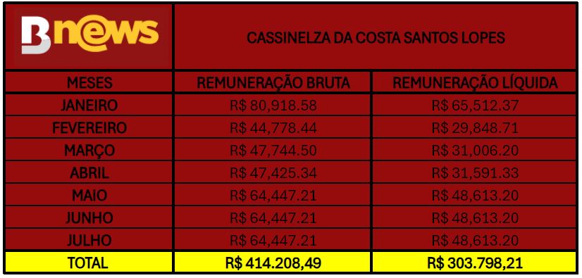 Em 2024, de janeiro a julho, Cassinelza Lopes recebeu R$ 414.208,49 (quatrocentos e catorze mil duzentos e oito reais e quarenta e nove centavos) e R$ 303.798,21 (trezentos e três mil setecentos e noventa e oito reais e vinte e um centavos), brutos e líquidos, respectivamente, mesmo sem trabalhar.