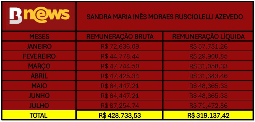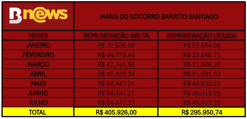De janeiro de julho de 2024, igualmente a Maria do Socorro Santiago, a magistrada recebeu R$ 405.926,00 (quatrocentos e cinco mil novecentos e vinte e seis reais) brutos e R$ 295.950,74 (duzentos e noventa e cinco mil novecentos e cinquenta reais e setenta e quatro centavos) líquidos.