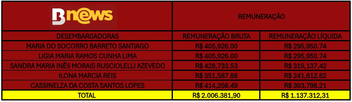 Os totais de R$ 428.733,53 (quatrocentos e vinte e oito mil setecentos e trinta e três reais e cinquenta e três centavos) e R$ 319.137,42 (trezentos e dezenove mil cento e trinta e sete reais e quarenta e dois centavos) foram os montates, bruto e líquido, respectivamente, recebidos pela desembargadora em 2024 até o momento.