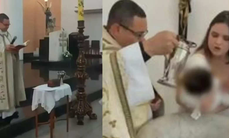 No momento central do rito, quando a água é derramada na cabeça da criança e costuma ser dita a frase “eu te batizo, [nome]”, a família afirma que o nome não foi mencionado.