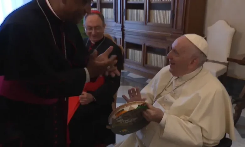 Papa Francisco toca pandeiro presenteado por bispos baianos