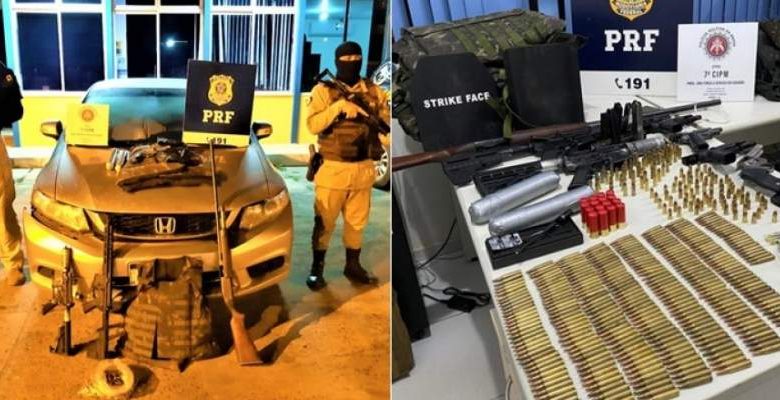 Na madrugada deste domingo (11), equipes da Polícia Rodoviária Federal (PRF) e da Polícia Militar da Bahia (PM-BA) apreenderam um verdadeiro arsenal de guerra, durante abordagem no Km 749 da BR 101. Os policiais realizavam fiscalização de combate à criminalidade na altura da cidade de Itabela, no no extremo sul baiano, quando foi dada ordem de parada a um Honda/Civic, com três ocupantes.