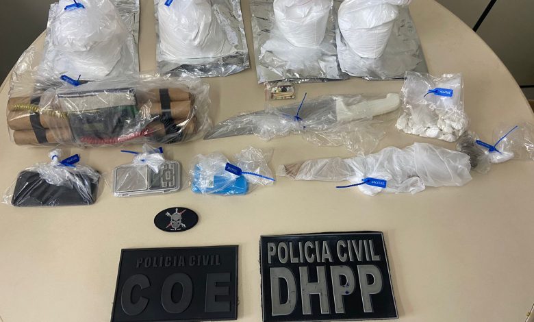 Ainda segundo a polícia, as equipes confirmaram que o imóvel era usado para separar, preparar e vender entorpecentes. No local, foram encontrados quatro sacos grandes de cocaína, 32 trouxas da mesma droga, outras duas de maconha, uma balança de precisão, uma máquina de cartão de crédito, duas facas e um artefato explosivo.