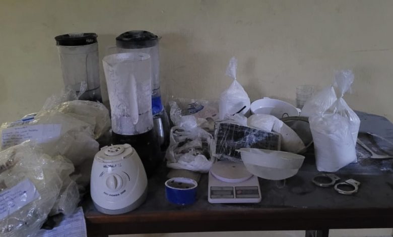 Durante o cumprimento de mandados de busca e apreensão, os agentes localizaram o imóvel usado como laboratório de drogas. No local, foram encontrados diversos equipamentos usados para o refino e embalagem de entorpecentes, como liquidificadores, balanças de precisão, máscaras, luvas e analgésicos, além de porções de maconha prontas para venda.