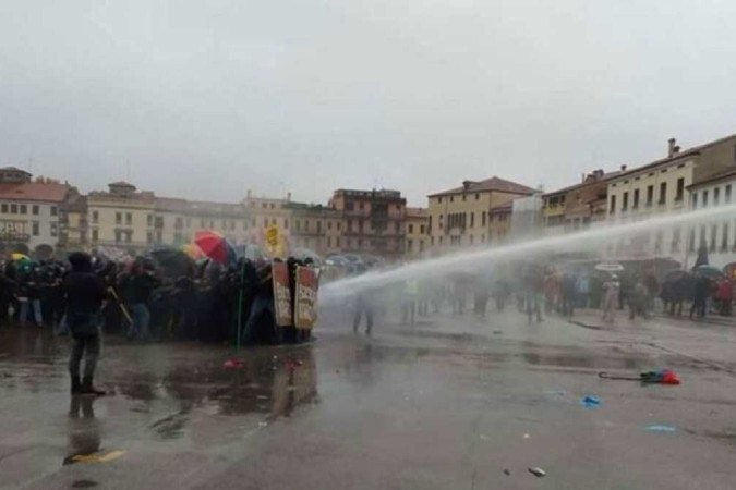 A polícia italiana usou jatos d’água para dispersar pessoas que protestavam contra o presidente Jair Bolsonaro em Pádua, no norte da Itália, nesta segunda-feira (1º/11). Em vídeos divulgados nas redes sociais, os policiais aparecem também utilizando cassetetes e bombas de gás lacrimogêneo contra os manifestantes.