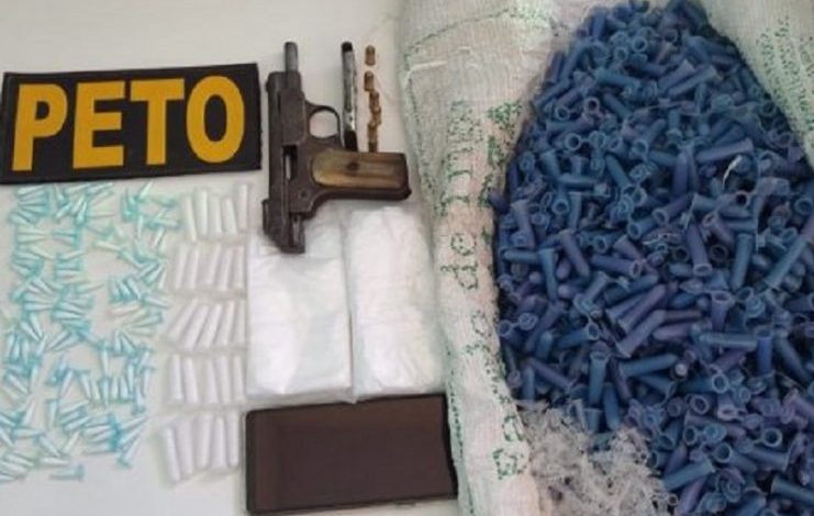 Uma arma modelo pistola calibre 765, 144 pinos contendo cocaína e pinos contendo uma substância farmacêutica foram aprendidos na tarde da última segunda-feira (04), pela equipe do Pelotão Especial Tático Operacional (PETO). De acordo com a PM, um jovem de 21 anos, foi preso suspeito pelo crime de tráfico de drogas.