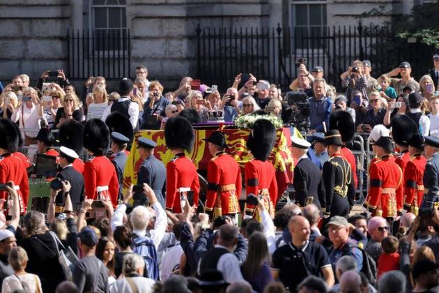 A procissão que leva o caixão com o corpo da rainha Elizabeth 2ª do Palácio de Buckingham até o Palácio de Westminster começou às 14h22 do horário local (10h22 em Brasília) nesta quarta-feira (14)