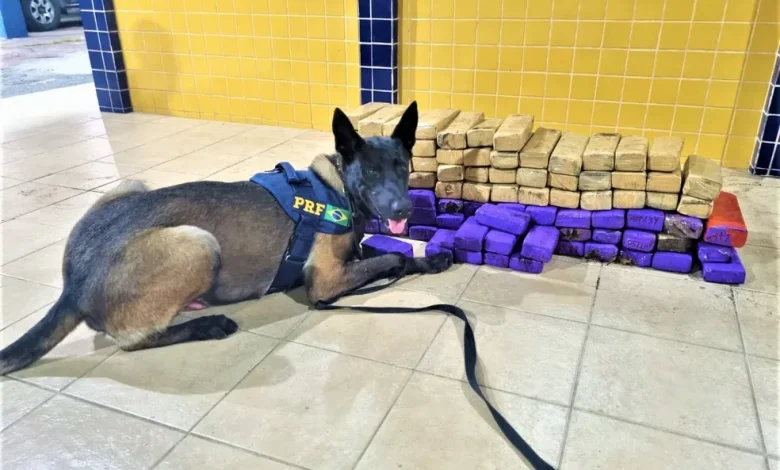 Em seguida, o cão farejador da PRF K9 Umbro sinalizou que dentro de duas malas havia droga. A equipe revistou as bagagens e encontrou os 69,70 kg da maconha, que era transportada em tabletes.