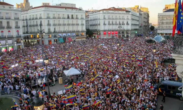 Em Madri, a icônica Puerta del Sol foi palco de um clamor popular, onde milhares de manifestantes expressaram seu apoio aos líderes oposicionistas da Venezuela, protestando com fervor contra o regime autoritário de Maduro.