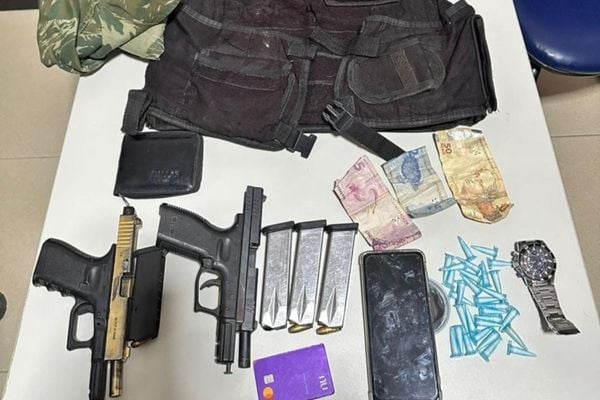 Com os suspeitos foram apreendidos duas pistolas calibres 9 milímetros e 380, quatro carregadores, 27 munições, um colete balístico, cocaína, roupa camuflada, um veículo modelo Sandero, cor branco, com restrição de roubo e outros itens usados no comércio Ilícito.