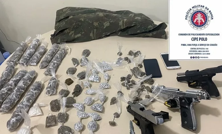Com os suspeitos foram apreendidas três pistolas 9mm, três carregadores e munições, além de 54 porções de maconha, 16 pacotes de crack, 2 pacotes com pinos de cocaína e celulares. Todo o material foi encaminhado para a Corregedoria Geral da Polícia Militar.