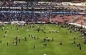 Segundo a Fox Sports México, os torcedores do Querétaro teriam invadido o gramado. A segurança teria falhado e, em seguida, os rivais do Atlas também saíram da arquibancada em direção ao campo. Divulgadas em redes sociais, as imagens dos momentos seguintes à invasão provocaram perplexidade.Em algumas, famílias correm com crianças para se proteger, enquanto torcedores são vítimas de espancamento.