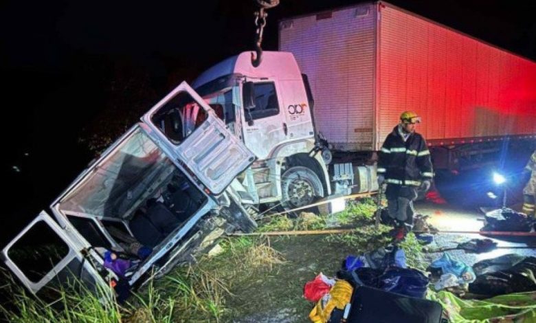 Já o Corpo de Bombeiros informou que, com o forte impacto da batida, a van foi jogada para a lateral da pista, ficando suspensa em um barranco com cinco metros de altura e com os corpos das vítimas presos às ferragens.