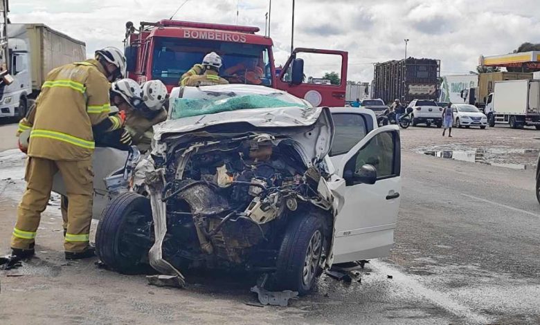 Um grave acidente foi registrado por volta das 5h30 desta segunda-feira (29), no quilômetro 171 da BR-101, no distrito de Humildes, em Feira de Santana. A colisão envolveu um caminhão-baú, carregado com feijão e com destino a cidade de Cabaceiras do Paraguaçu, e um veículo de passeio modelo Mobi branco.