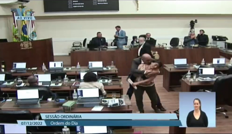 No vídeo, é possível ver o momento em que a vereadora anda pelo corredor do Plenário, quando Marquinhos estende a mão para cumprimentá-la. O gesto vira uma agarrada e ele se levanta, abraçando-a por trás e a beijando na bochecha. Ele se solta e volta rindo para seu lugar.